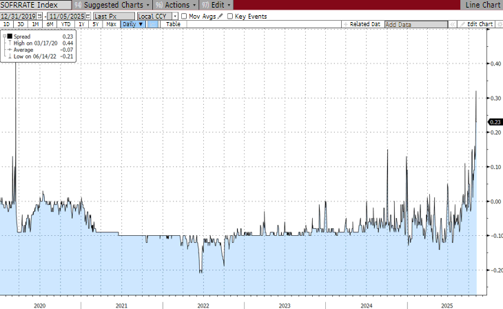 SOFR-IOBR Spread (12/31/19-11/5/25) [Bloomberg]